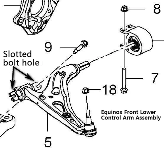 Aukščiau pateiktame paveikslėlyje parodyta priekinė apatinė „Chevrolet Equinox“ valdymo svirties mazgas. Rodyklė rodo atviros varžto angos struktūrą įvorės sąrankoje.