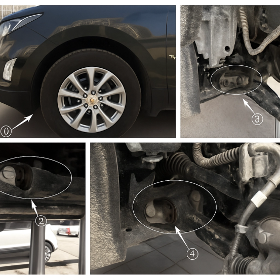 Ankstesnis nuotraukų rinkinys iliustruoja Chevrolet Equinox priekinės pakabos valdymo svirties įvorės gedimo konstrukcinę būklę. Jis informuoja naudotojus, kad, kaip parodyta aukščiau esančioje diagramoje, galimas gedimo konstrukcinis komponentas gali būti apžiūrėtas pasukus vairą iki visiško fiksavimo ① padėtyje. Įvorės agregato saugos patikrinimas turėtų būti atliekamas naudojant nuotraukas, darytas keliose vietose, įskaitant ②, , ir ④ vietas.