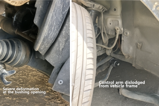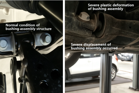 Palyginama normaliai veikianti valdymo svirties įvorės mazgas (kaip parodyta apatiniame kairiajame paveikslėlyje) ir sugedusi įvorės mazga (kaip parodyta apatiniame dešiniajame paveikslėlyje). Jis atkreipia dėmesį į tai, kad palyginus kairįjį ir dešinįjį paveikslėlius žemiau, nesunku pastebėti, kad tarpas tarp įprastos valdymo svirties įvorės kairėje yra vienodas ir neturėtų būti akivaizdaus lenkimo ar deformacijos, kaip parodyta dešiniajame paveikslėlyje. Jei transporto priemonės būklė yra tokia, kaip parodyta dešiniajame paveikslėlyje, ji jau kelia pavojų saugai eksploatacijos metu.