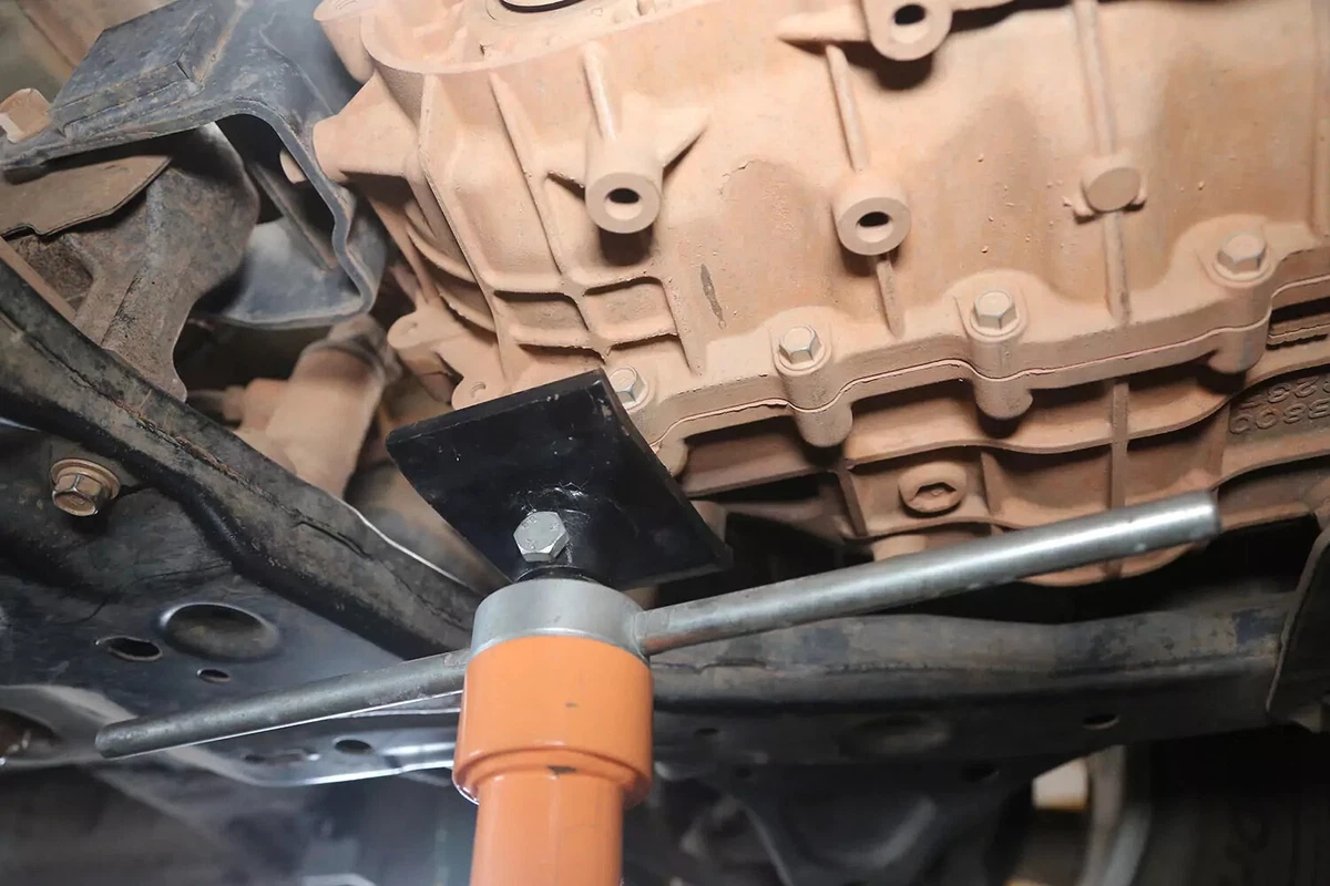 Nuimkite skersinį varžtą. Tada nuimkite transmisijos tvirtinimo varžtus nuo važiuoklės.