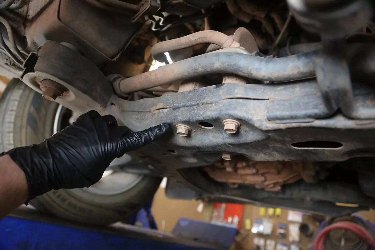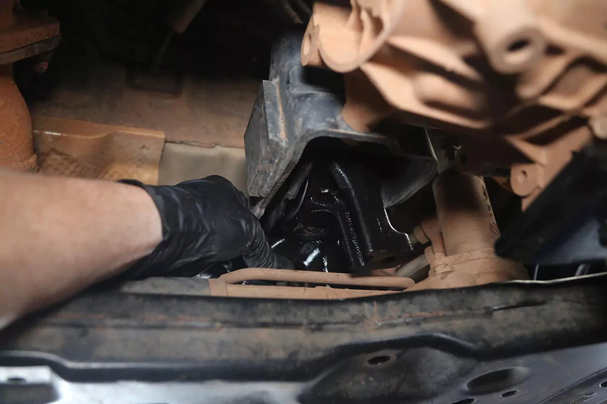 Mūsų FWD demonstraciniame automobilyje transmisijos laikiklis yra už transmisijos ant priekinio rėmo. Jei turite AWD, 4WD arba RWD automobilį, laikiklis tikriausiai yra pačioje transmisijos gale, centre beveik tiesiai po automobiliu, tarp transmisijos ir skersinio.