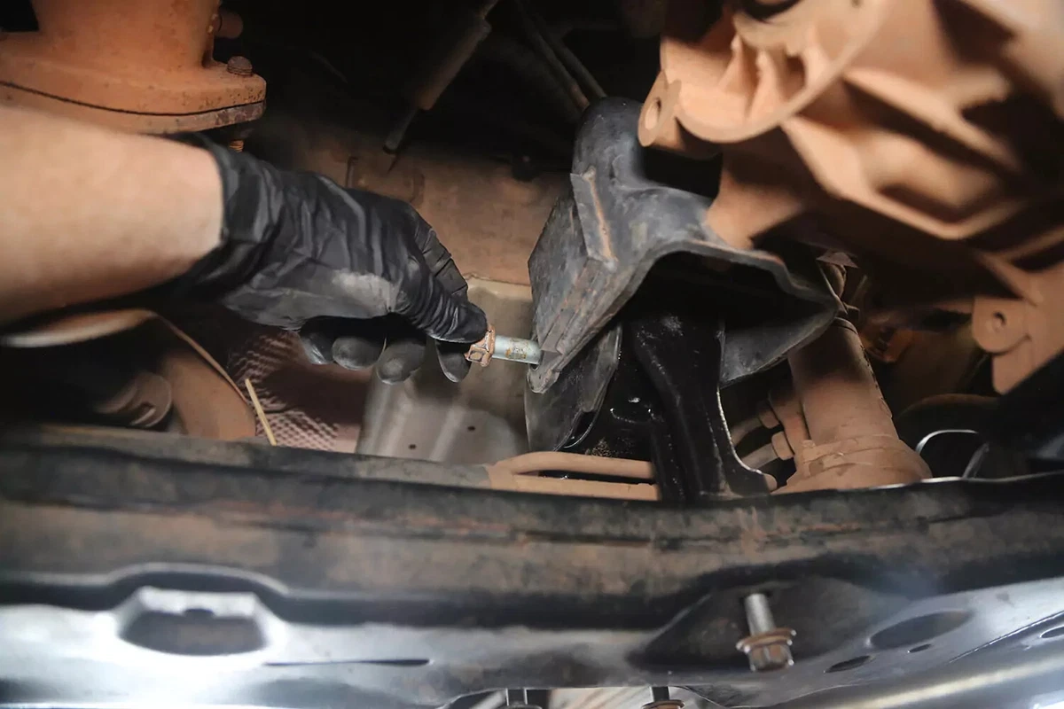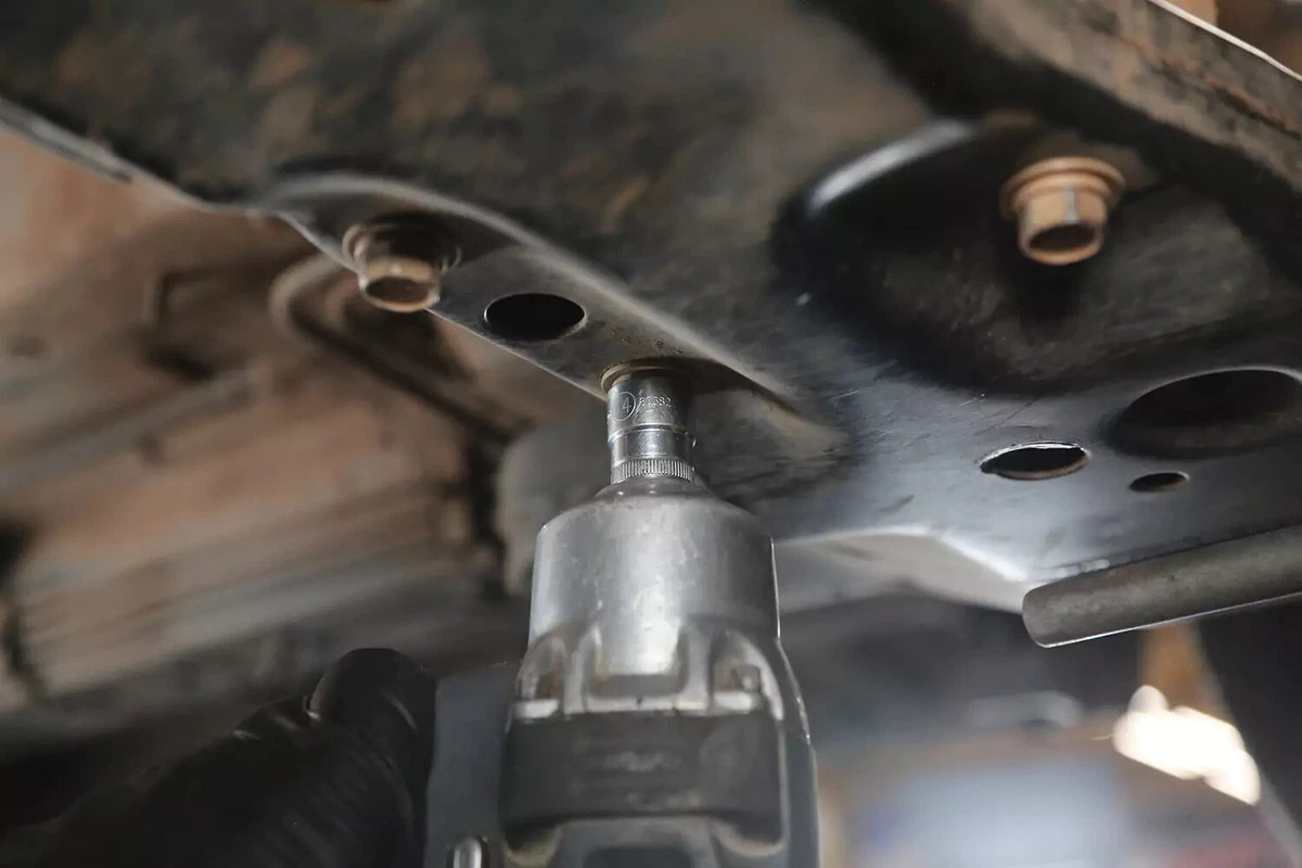 Mūsų demonstraciniam automobiliui laikiklis turi tris varžtus ant rėmo ir vieną varžtą prie transmisijos. Dar keturi varžtai pritvirtina transmisijos laikiklį prie transmisijos. Daugumoje transporto priemonių jų nereikia išimti.