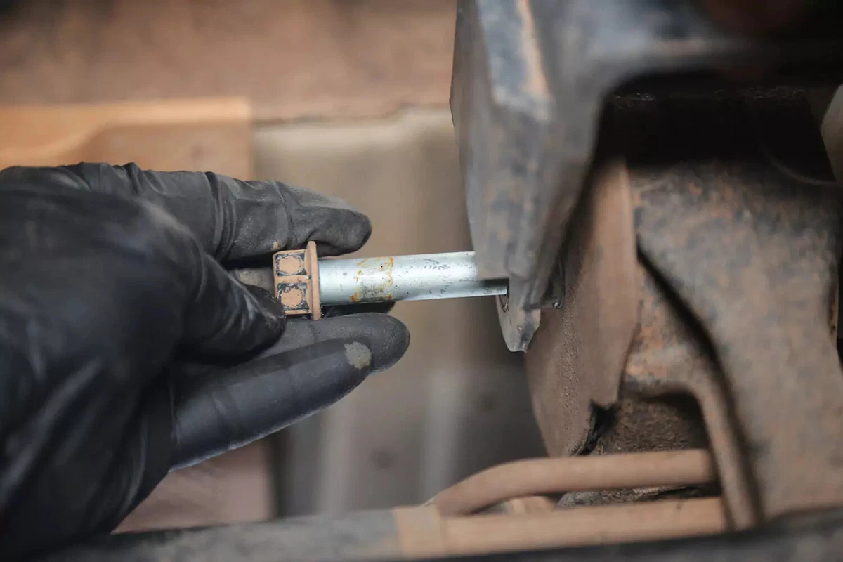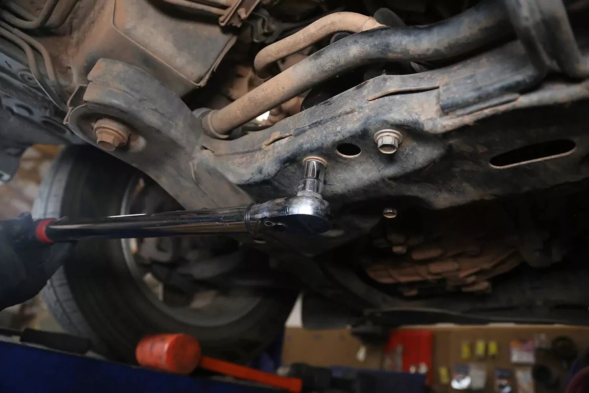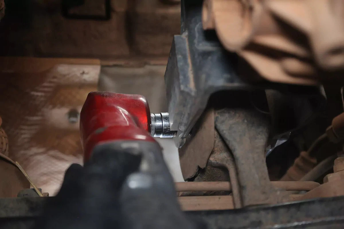 Mūsų demonstracinėje transporto priemonėje yra skersinis varžtas, kuris nuimamas naudojant veržliaraktį vienoje pusėje ir lizdą kitoje. Juos gali būti sunku pašalinti ankštose patalpose. Norėdami gauti reikiamą svertą, naudokite pertraukimo strypą, smūginį veržliaraktį arba veržliaraktį.