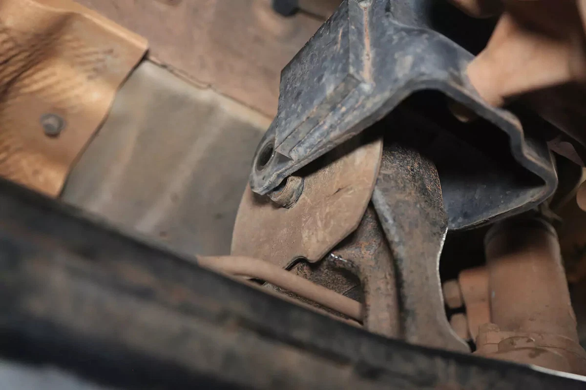Mūsų demonstracinėje transporto priemonėje yra atramos įpjovos, kurios užfiksuoja laikiklį transmisijos laikiklio laikiklyje. Mums reikėjo pritaikyti papildomą pakėlimą, kad laikiklis būtų laisvas.